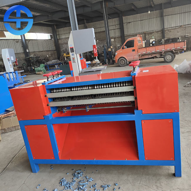 Τα θερμαντικά σώματα κλιματιστικών μηχανημάτων σχεδόν αποκλειστικά αποτελούνται από το σωλήνα χαλκού και το πτερύγιο αργιλίου. Για να ανακυκλώσουν το θερμαντικό σώμα εναλλασσόμενου ρεύματος απορρίματος, ο χαλκός και το αργίλιο πρόκειται να χωριστούν για να πάρουν μια υψηλότερη τιμή. Η μηχανή ανακύκλωσης θερμαντικών σωμάτων σχεδιάζεται στη λουρίδα και χωρίζει το θερμαντικό σώμα απορρίματος για την ανακύκλωση του χαλκού και του αργιλίου με την υψηλή αποδοτικότητα και τη σταθερή απόδοση. Υπάρχουν τρία είδη κεντρικής απόστασης λεπίδων: 19mm, 21mm και 25mm δηλαδή μπορεί να γδύσει το θερμαντικό σώμα η του οποίου κεντρική απόσταση σωλήνων χαλκού είναι 19mm, 21mm ή 25mm. Πριν από επεξεργασμένος, τα θερμαντικά σώματα θα κοπούν με ένα πριόνι ζωνών στα κομμάτια ορισμένου πλάτους. Μπορεί να χωρίσει ένα στρώμα ή τα θερμαντικά σώματα δύο στρωμάτων. Όταν τα θερμαντικά σώματα είναι περισσότερα από δύο στρώματα, θα κοπεί σε ένα στρώμα ή δύο στρώματα από τη μηχανή πριονιών ζωνών.
